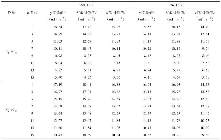 表1 C1-nC10和N2-nC10混合物在298.15 K、326.15 K下的纳米孔中测量和模型预测的界面张力(IFT)