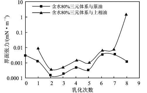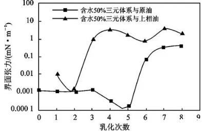 从总体上看,水相与原油间的界面张力低于其与上相油间的界面张力,在乳化第6次以后两者开始趋同。说明乳化会导致油相中的组成发生变化,进而导致油相性质发生变化。因此在复合驱驱替的适当时机应对驱油体系的配方进行相应调整。