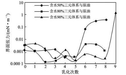 界面张力的高低反应体系启动剩余油的能力,分析含水不同的三元体系多次乳化后与原油间的界面张力见图1。