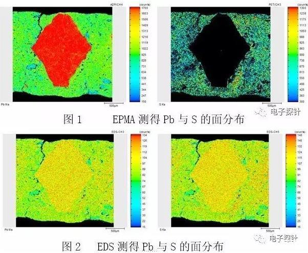 图2为EDS测试结果,显示Pb与S元素分布区域基本一致的现象,此为假象。这是由于两个元素的主峰相互重叠,在能量上已不能被仪器区分开的缘故。