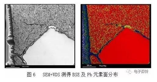 图6为某厂商生产的SEM+WDS测试结果。其测试的大小范围受限,还不到EPMA测试区域的一半,(EPMA可以使用样品台扫描,实现更大区域的分析)也就不能查看整个负极板上待测元素的分布结果。由于S元素的含量很低,测试没有给出结果。