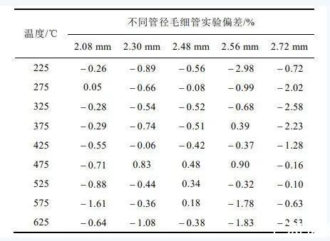 不同管径毛细管在不同温度下实验结果偏差如上表2所示。可知,2.72 mm内径毛细管与基准值偏差最大,且在不同温度的实验偏差波动也是最大,从表中结果可以得出,随着毛细管内径增大,实验结果偏差和偏差波动随之增大。而2.08mm、2.30mm、2.48mm三个管径的偏差相差不大,且从低温到高温偏差范围波动较小。因此,在均匀鼓泡下,实验使用的毛细管管径应控制在2.0~2.5mm。