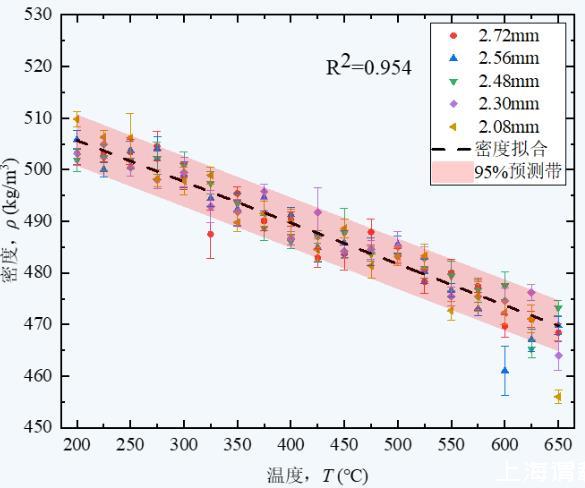 上图5给出了温度T在200~650℃范围内,使用不同管径毛细管测量的液态锂密度实验值及其拟合曲线。可知,拟合结果具有良好线性度。各个温度点的密度实验结果偏差小于±5 kg/m3,相对误差为±1%,且实验结果均在线性拟合95%预测带中,其中预测带表示对多次实验结果分析,充分考虑实验偶然误差,单次实验结果在预测带之间,说明实验结果具有较好可信度。