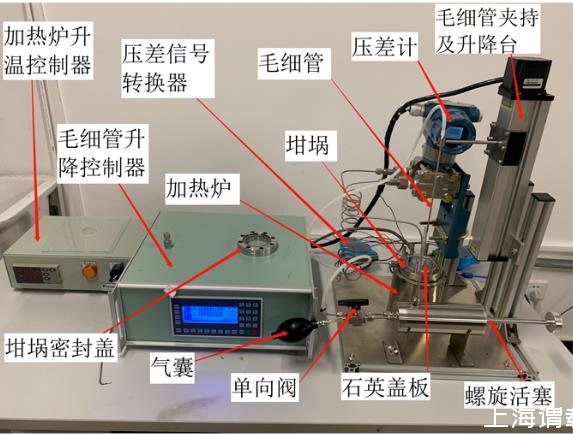 下图为本文设计的测量装置原理示意图与实物图,该装置主要由4个系统组成:气路系统、毛细管升降系统、加热恒温系统以及数据采集系统。