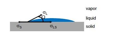 4、接触角在在三种介质的边界面相交于一点的情形中,接触线受到三个不同边界面的表面张力,为了维持平衡,表面张力的合力在这些方向上的分量必须等于零,这就要求三个边界面交成一定的角度。