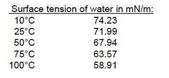 2、同种液体,在不同温度时表面张力会不同比如下面表格温度越低表面张力越大;