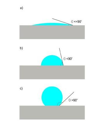 由于接触角的不同和浸润与非浸润的情况就可以解释题主所说的完全不同的水滴效果常见的有下图三种情况;