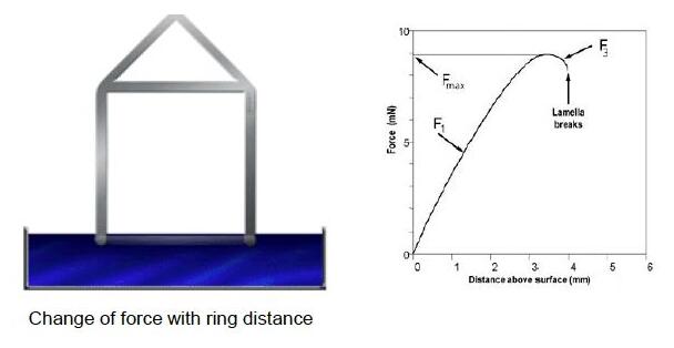 由于距离不同表现出的表面张力也不同,因此测量往往取最大值,也就是右方图中的Fmax